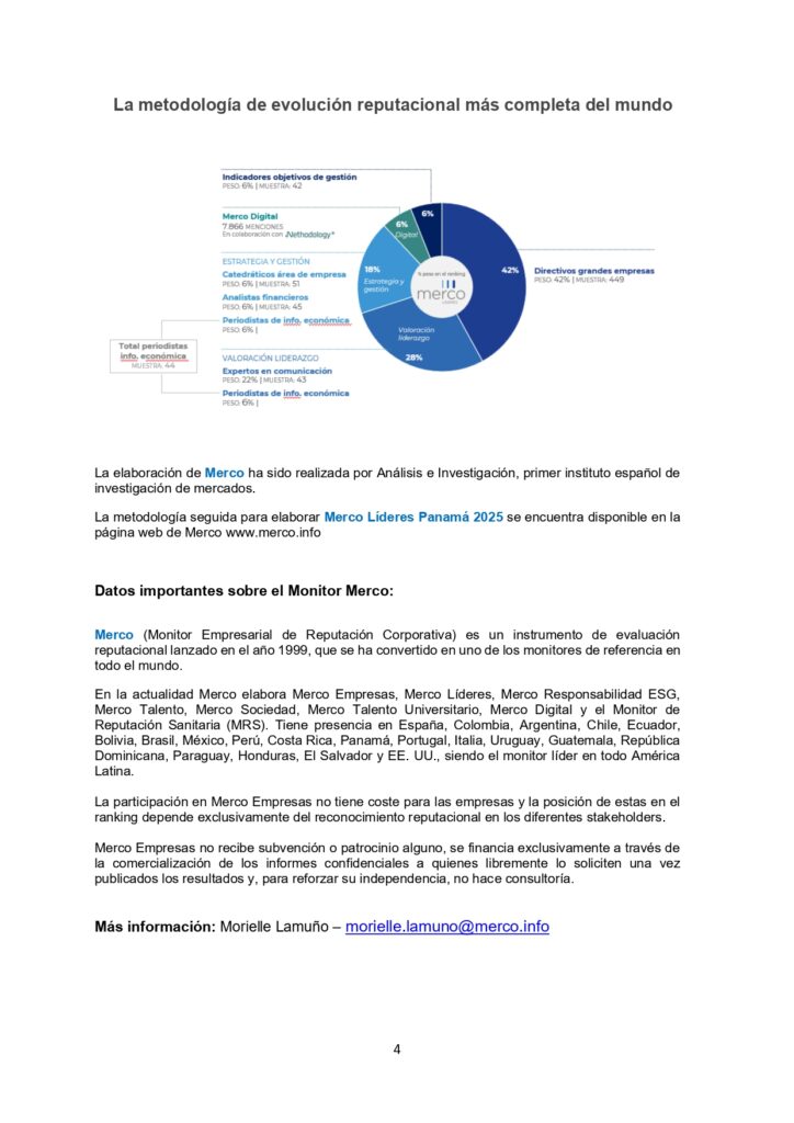 El estudio, desarrollado por Merco (Monitor Empresarial de Reputación Corporativa), analiza la percepción y valoración de directivos, expertos en comunicación, periodistas de información económica, analistas financieros y académicos de economía y empresa. En esta edición, se evaluaron más de 400 directivos y líderes empresariales panameños, consolidando la credibilidad del ranking como referente de reputación en la región.